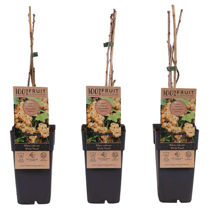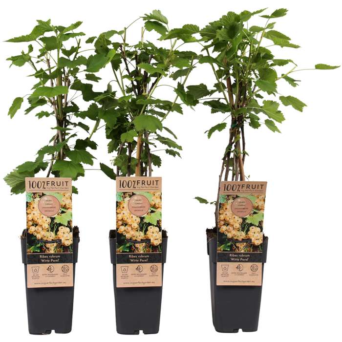 ‘Ribes rubrum Witte Parel’ is een bekende witte aalbes. De struik is zelfbestuivend en bloeit in april met onopvallende groen-witte bloempjes in hangende trossen. Daaruit vormen zich heldere geel-witte bessen aan kleine trossen. De bessen zijn te oogsten vanaf juni en hebben een zure, maar frisse smaak. Hoe meer zon de struik krijgt des te beter zal de oogst van de bessen zijn. Van de bessen kan je heerlijke jam of sap maken, maar je kan ze ook gelijk van de struik eten. Snoei de struik voor het behoud van veel vruchten. Dit doe je in de winter door de (zij)takken weg te knippen. In de winter verliest hij zijn blad en kan zelfs temperaturen tot -34 graden Celsius zonder problemen doorstaan. Je kan hem plaatsen in de tuin, maar natuurlijk ook op een balkon of terras. Hij groeit in elke grond en staat graag in de volle zon.