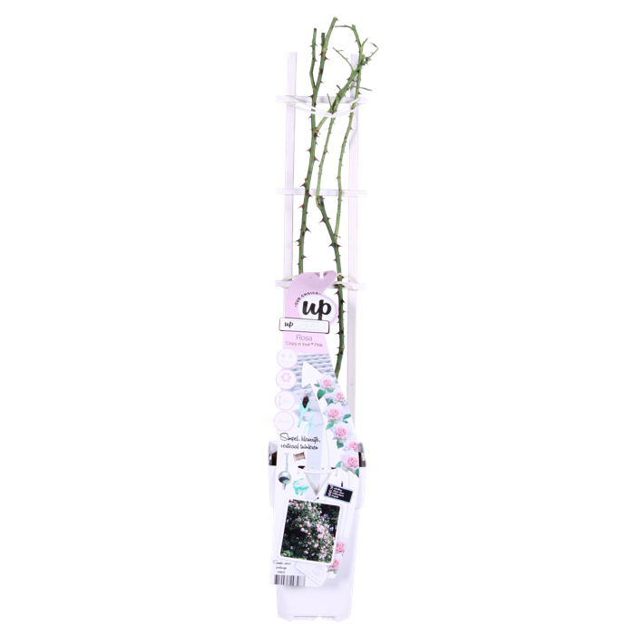 ‘Rosa Crazy in love Pink’ is een populaire roze klimroos met frisgroene glimmende bladeren. Rozen behoren al honderden jaren tot een van de bekendste en meest aangeplante groep planten. De roos heeft in verschillende culturen een symbolische waarde. Al in de oudheid werden er tempels en paleizen mee versierd. De roos begint te bloeien in juni en bloeit door tot aan de eerste vorst in oktober of november. Om het bloeien te stimuleren is het raadzaam om oude en uitgebloeide bloemen te verwijderen. De klimroos houdt van een zonnige standplaats, en voor de mooiste groei kun je hem het beste om het jaar tot zo’n 30 centimeter boven de grond terug snoeien. Je voorkomt op deze manier dat de roos kaal wordt van onderen. De beste tijd hiervoor is het najaar, of het vroege voorjaar. De roos heeft wat hulp nodig bij het klimmen. Dit kan door de takken te leiden langs een rek, paal of schutting. Rozen staan erom bekend veel voeding te gebruiken. Om de klimroos gezond te houden adviseren we om hem jaarlijks bij te voeden met kunstmest speciaal geschikt voor rozen.