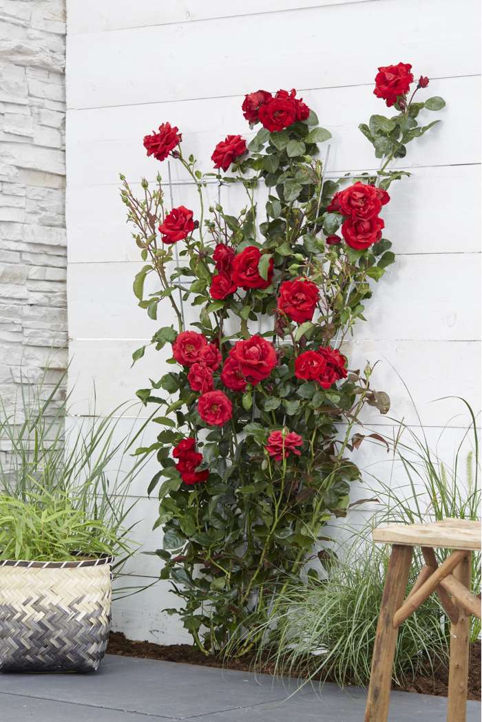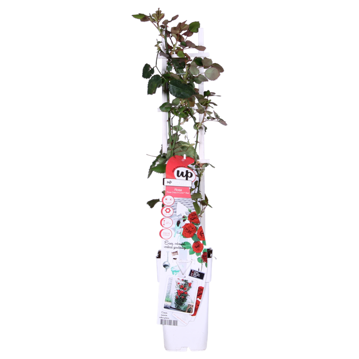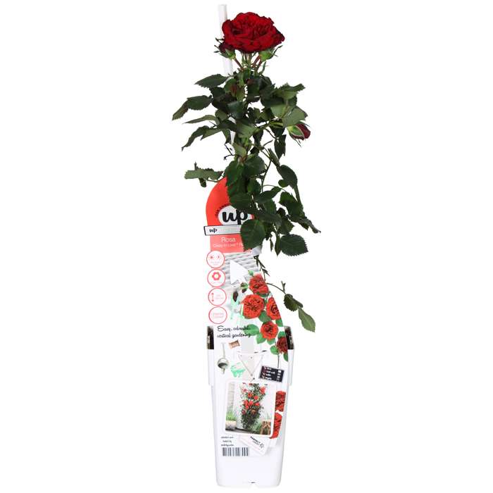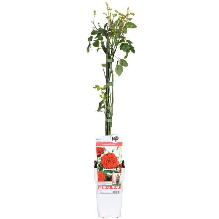 ‘Rosa Crazy in love Red’ is een populaire rode klimroos met frisgroene glimmende bladeren. R Rozen behoren al honderden jaren tot een van de bekendste en meest aangeplante groep planten. De roos heeft in verschillende culturen een symbolische waarde. Al in de oudheid werden er tempels en paleizen mee versierd. De roos begint te bloeien in juni en bloeit door tot aan de eerste vorst in oktober of november. Om het bloeien te stimuleren is het raadzaam om oude en uitgebloeide bloemen te verwijderen. De klimroos houdt van een zonnige standplaats, en voor de mooiste groei kun je hem het beste om het jaar tot zo’n 30 centimeter boven de grond terug snoeien. Je voorkomt op deze manier dat de roos kaal wordt van onderen. De beste tijd hiervoor is het najaar, of het vroege voorjaar. De roos heeft wat hulp nodig bij het klimmen. Dit kan door de takken te leiden langs een rek, paal of schutting. Rozen staan erom bekend veel voeding te gebruiken. Om de klimroos gezond te houden adviseren we om hem jaarlijks bij te voeden met kunstmest speciaal geschikt voor rozen. adviseren we om hem jaarlijks bij te voeden met kunstmest speciaal geschikt voor rozen.