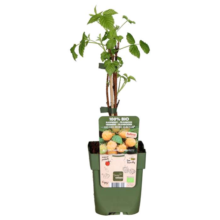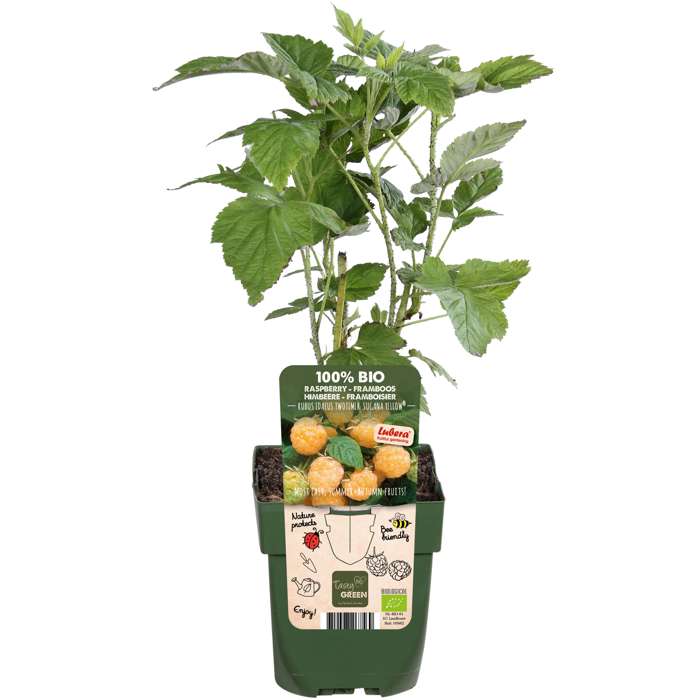 ‘Rubus Idaeus Twotimer Sugana Yellow’ de enige gele framboos die twee keer per jaar vruchten geeft. Een echte aanwinst voor je tuin! De frambozen zijn heerlijk zoet en hebben een mooie gele kleur. Gele frambozen smaken wat zachter en zoeter dan de bekende roze frambozen. Ze zijn erg gezond, ze zitten vol antioxidanten, mineralen en vitaminen. De struik groeit rechtop en kan ongeveer 200 cm hoog worden. Deze soort is geschikt voor de kleinere tuinen, zelfs voor op het balkon. In juni is de eerste oogst op de oude takken van de struik, in het najaar de tweede oogst op de nieuwe takken. De framboos is makkelijk in onderhoud en kan overleven in alle klimaten. Het eerste jaar hoef je de struik niet te snoeien. Daarna kun je in het vroege voorjaar de takken terugsnoeien. De plant heeft een stabiele groei en een goede weerstand tegen ziektes. Vogels zijn ook gek op frambozen, dus bescherm de struik door bijvoorbeeld een net te plaatsen.