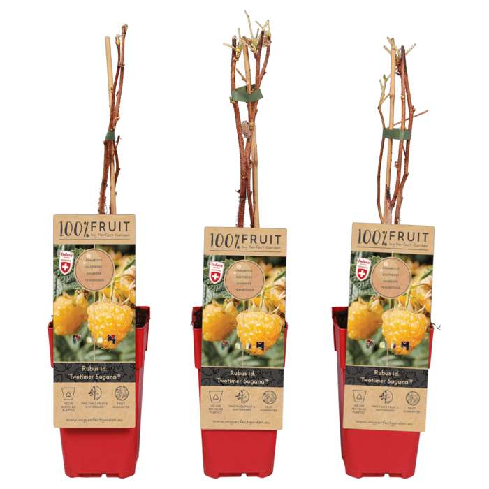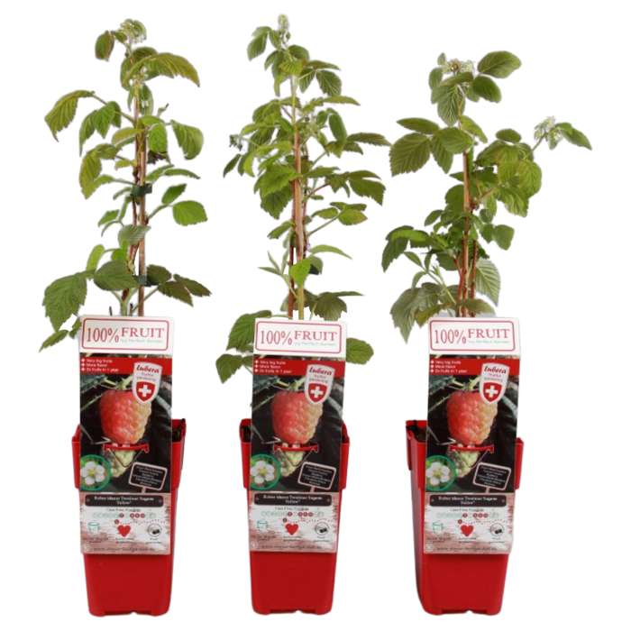 ‘Rubus Idaeus Twotimer Sugana Yellow’ de enige gele framboos die twee keer per jaar vruchten geeft. Een echte aanwinst voor je tuin! De frambozen zijn heerlijk zoet en hebben een mooie gele kleur. Gele frambozen smaken wat zachter en zoeter dan de bekende roze frambozen. Ze zijn erg gezond, ze zitten vol antioxidanten, mineralen en vitaminen. De struik groeit rechtop en kan ongeveer 200 cm hoog worden. Deze soort is geschikt voor de kleinere tuinen, zelfs voor op het balkon. In juni is de eerste oogst op de oude takken van de struik, in het najaar de tweede oogst op de nieuwe takken. De framboos is makkelijk in onderhoud en kan overleven in alle klimaten. Het eerste jaar hoef je de struik niet te snoeien. Daarna kun je in het vroege voorjaar de takken terugsnoeien. De plant heeft een stabiele groei en een goede weerstand tegen ziektes. Vogels zijn ook gek op frambozen, dus bescherm de struik door bijvoorbeeld een net te plaatsen.