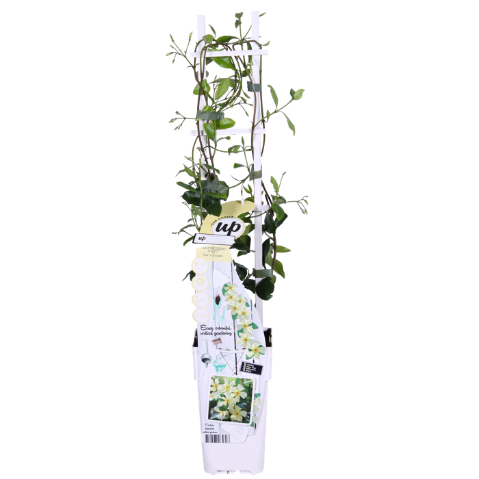 ‘Trachelospermum Star of Toscana’ ook wel sterjasmijn genoemd door zijn zachtgele, stervormige bloemen. Het is een Mediterrane wintergroene klimplant en winterhard tot wel -10˚C. De uitbundige bloeitijd is van begin juni tot eind augustus, in deze periode verspreiden de bloemen een heerlijke zoete geur. De klimplant heeft ovale, donkergroene bladeren en ondersteuning nodig van een klimrek of schutting om goed te kunnen groeien. De nieuw uitlopende takken van deze sterjasmijn krullen langs een gaaswerk of schutting mooi omhoog. De beste plaats is zonnig tot halfschaduw en uit de volle wind. De sterjasmijn kan in de volle grond geplant worden in een normale voedselrijke grond. Ook in een ruime pot op het terras of balkon groeit de sterjasmijn goed. Op een zonnige plaats kan hij ook als bodembedekker gebruikt worden. De klimplant kan redelijk goed tegen een drogere periode, maar tijdens warme en droge periodes kun je hem extra water geven. Snoeien is alleen nodig om de plant in de juiste vorm te knippen. Dit kan je het beste doen in het vroege voorjaar of na de bloeiperiode. De sterjasmijn is een vrij langzame groeier en het zal dus een aantal jaren duren voor die zijn maximale hoogte heeft behaald.