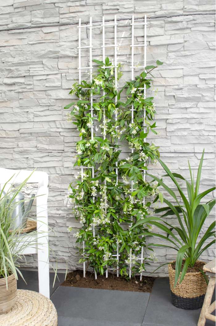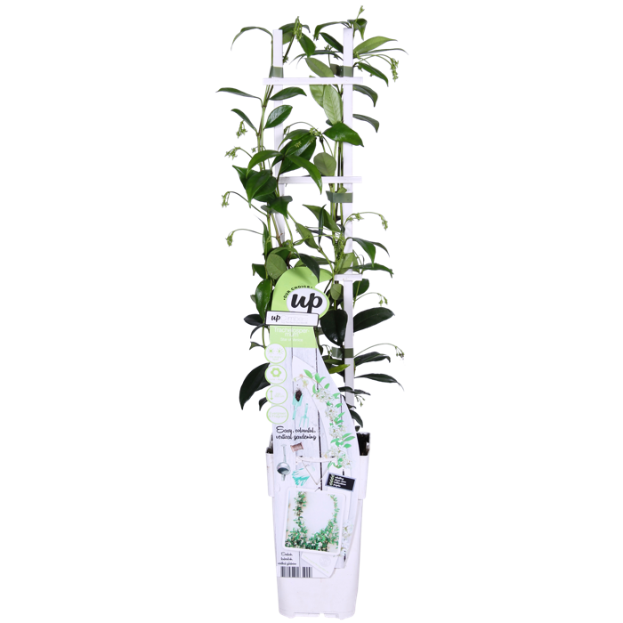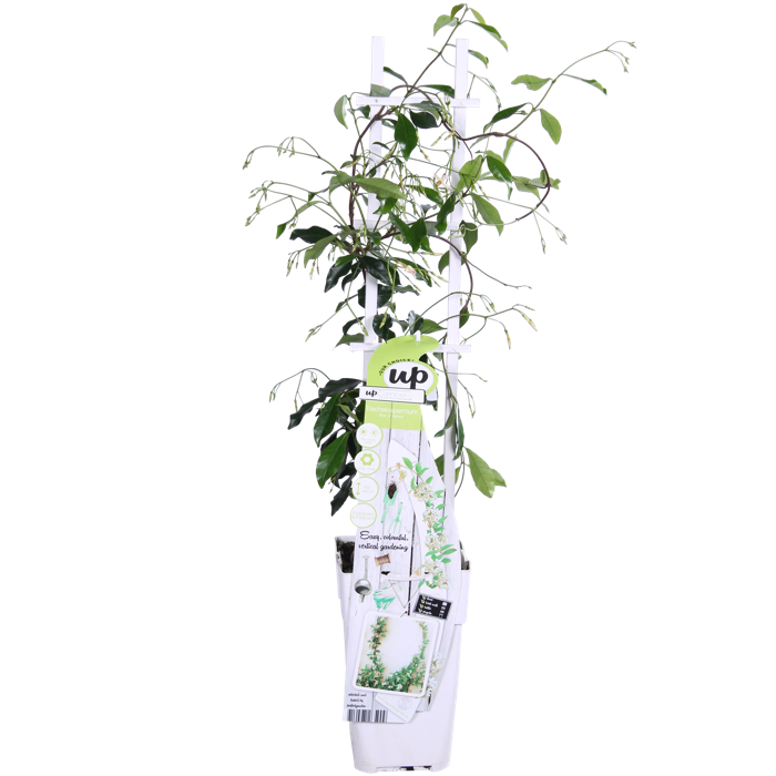 ‘Trachelospermum Star of Venice’ ook wel sterjasmijn genoemd door zijn witte, stervormige bloemen. Het is een Mediterrane wintergroene klimplant en winterhard tot wel -10˚C. De uitbundige bloeitijd is van begin juni tot eind augustus, in deze periode verspreiden de bloemen een heerlijke zoete geur. De klimplant heeft ovale, donkergroene bladeren en ondersteuning nodig van een klimrek of schutting om goed te kunnen groeien. De nieuw uitlopende takken van deze sterjasmijn krullen langs een gaaswerk of schutting mooi omhoog. De beste plaats is zonnig tot halfschaduw en uit de volle wind. De sterjasmijn kan in de volle grond geplant worden in een normale voedselrijke grond. Ook in een ruime pot op het terras of balkon groeit de sterjasmijn goed. Op een zonnige plaats kan hij ook als bodembedekker gebruikt worden. De klimplant kan redelijk goed tegen een drogere periode, maar tijdens warme en droge periodes kun je hem extra water geven. Snoeien is alleen nodig om de plant in de juiste vorm te knippen. Dit kan je het beste doen in het vroege voorjaar of na de bloeiperiode. De sterjasmijn is een vrij langzame groeier en het zal dus een aantal jaren duren voor die zijn maximale hoogte heeft behaald.