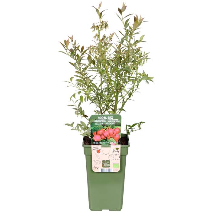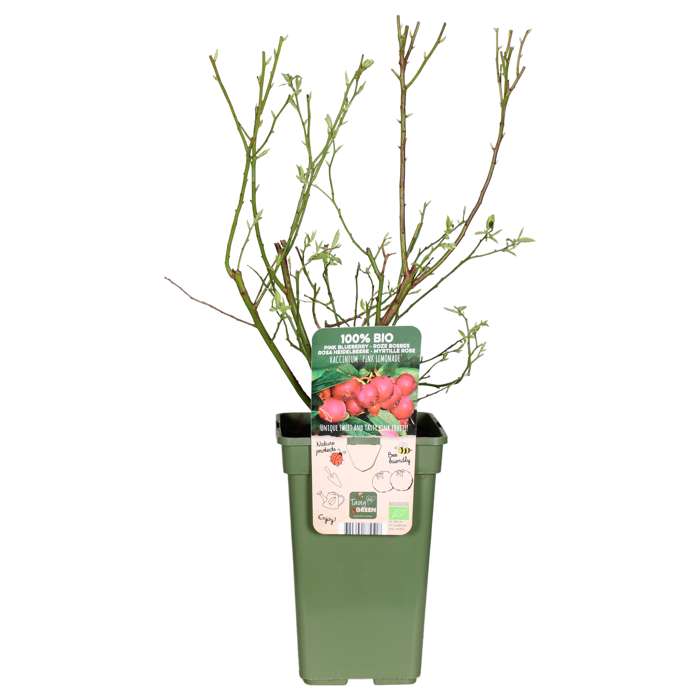 ‘Vaccinium Pink Lemonade’ is een bijzondere bosbes variant met roze gekleurde bessen. De struik heeft fijne puntige groene bladeren. In de herfst veranderen de bladeren in fel oranje, een lust voor het oog. De bloemen die rond mei verschijnen zijn ook prachtig, wit-roze van kleur en klokvormig. De vruchten hebben in eerste instantie een lichtgroene kleur en als ze rijp zijn een dieproze kleur. Je kan ze plukken tussen juli en augustus. Pluk de bessen op tijd, als je te vroeg plukt is de bes niet lekker van smaak en pluk je te laat dan kun je de bes niet lang bewaren. In de koelkast kun je ze nog een week goed houden. De bessen hebben een stevige en aangename structuur en smaken heerlijk zoet. Het is een gezonde bes met veel antioxidanten, vitaminen en mineralen. De Blauwe bes staat graag in de zon in een vochtige, zure bodem met een voorkeur voor zand- en veengrond. Knip in het vroege voorjaar overhangende takken weg.