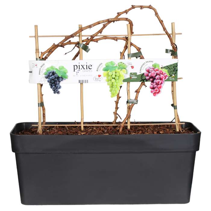 Vitis Pixie Grape is een dwergdruif die kleine trossen druiven produceert, een gemiddelde tros is 10 cm groot. De Pixie Grape is een van nature voorkomende mutant van Vitus Vinifera ‘Pinot Meunier’, een druivensoort die wordt gebruikt om wijn en champagne te produceren. In tegenstelling tot traditionele wijnstokken waarbij het tot drie jaar kan duren om druiven te produceren, begint de Pixie-druif in het eerste jaar al de kleine druiven te produceren. De druif heeft doordat hij compact is een unieke uitstraling en is extra leuk voor de wijnliefhebber. Deze dwergwijnstokken hebben korte stengels en geven de voorkeur aan bloemen in plaats van ranken. Ze zijn slechts 30 tot 50 cm hoog, daardoor is de Vitis Pixie makkelijk te kweken in kassen of op het balkon of terras. Deze plant is makkelijk te verzorgen dus ook geschikt voor de minder ervaren tuinier.