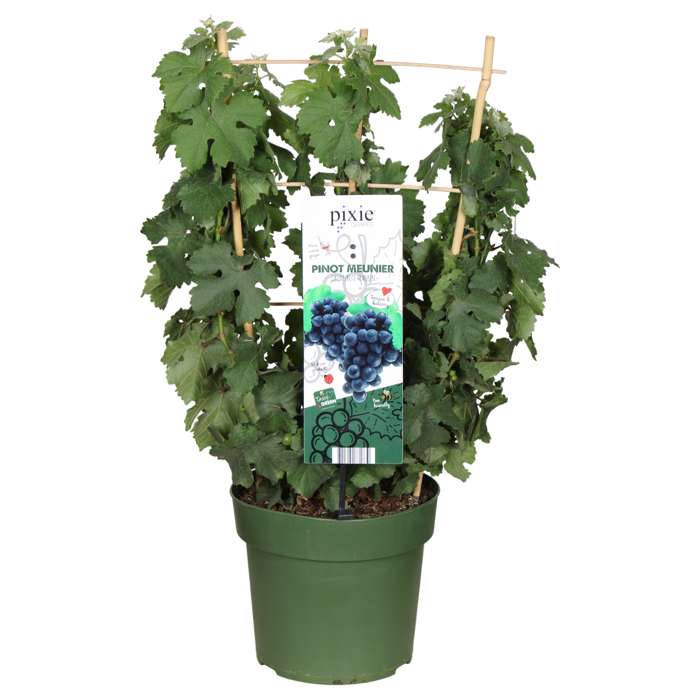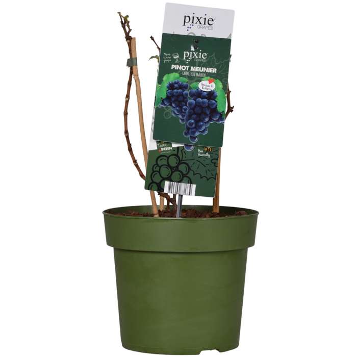 ‘Pinot Noir’ is een blauwe druivenras waarmee voornamelijk rode wijn wordt gemaakt. De smaak van Pinot Noir is enorm divers. Maar algemeen gezegd geeft Pinot Noir een lichte tot medium body met kersen, framboos en aardbei en vaak wat aardse, soms kruidige geuren en smaken. Vitis Pixie Grape is een dwergdruif die kleine trossen druiven produceert, een gemiddelde tros is 10 cm groot. De Pixie Grape is een van nature voorkomende mutant van Vitus Vinifera ‘Pinot Meunier’, een druivensoort die wordt gebruikt om wijn en champagne te produceren. In tegenstelling tot traditionele wijnstokken waarbij het tot drie jaar kan duren om druiven te produceren, begint de Pixie-druif in het eerste jaar al de kleine druiven te produceren. De druif heeft doordat hij compact is een unieke uitstraling en is extra leuk voor de wijnliefhebber. Deze dwergwijnstokken hebben korte stengels en geven de voorkeur aan bloemen in plaats van ranken. Ze zijn slechts 30 tot 50 cm hoog, daardoor is de Vitis Pixie makkelijk te kweken in kassen of op het balkon of terras. Deze plant is makkelijk te verzorgen dus ook geschikt voor de minder ervaren tuinier.