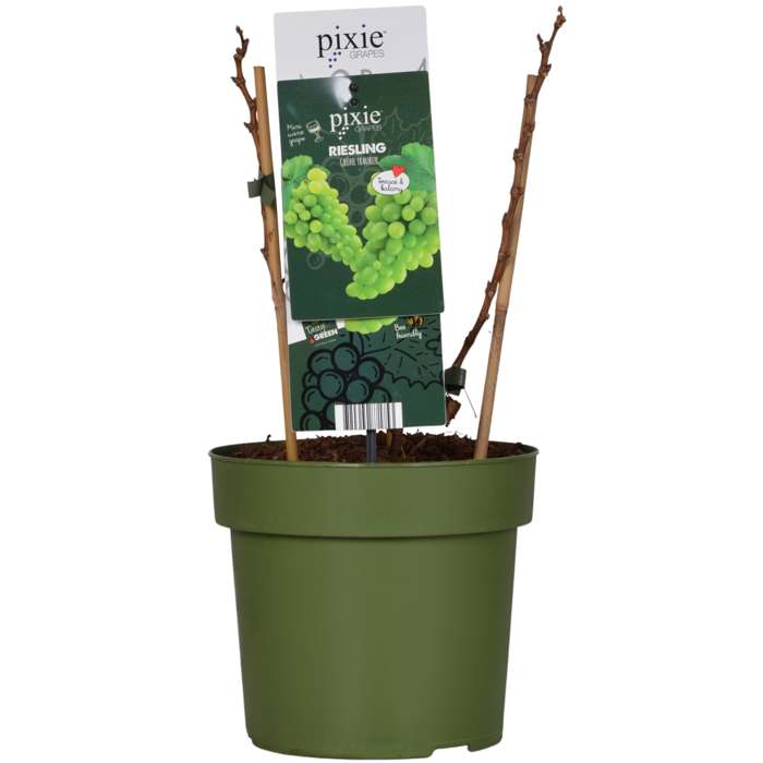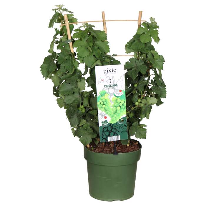 ‘Riesling’ is een wit druivenras. Riesling wijn staat bekend om zijn aromatische kracht, variërend van strakdroog tot volzoet met altijd duidelijk waarneembare fijne zuren. Vitis Pixie Grape is een dwergdruif die kleine trossen druiven produceert, een gemiddelde tros is 10 cm groot. De Pixie Grape is een van nature voorkomende mutant van Vitus Vinifera ‘Pinot Meunier’, een druivensoort die wordt gebruikt om wijn en champagne te produceren. In tegenstelling tot traditionele wijnstokken waarbij het tot drie jaar kan duren om druiven te produceren, begint de Pixie-druif in het eerste jaar al de kleine druiven te produceren. De druif heeft doordat hij compact is een unieke uitstraling en is extra leuk voor de wijnliefhebber. Deze dwergwijnstokken hebben korte stengels en geven de voorkeur aan bloemen in plaats van ranken. Ze zijn slechts 30 tot 50 cm hoog, daardoor is de Vitis Pixie makkelijk te kweken in kassen of op het balkon of terras. Deze plant is makkelijk te verzorgen dus ook geschikt voor de minder ervaren tuinier.
