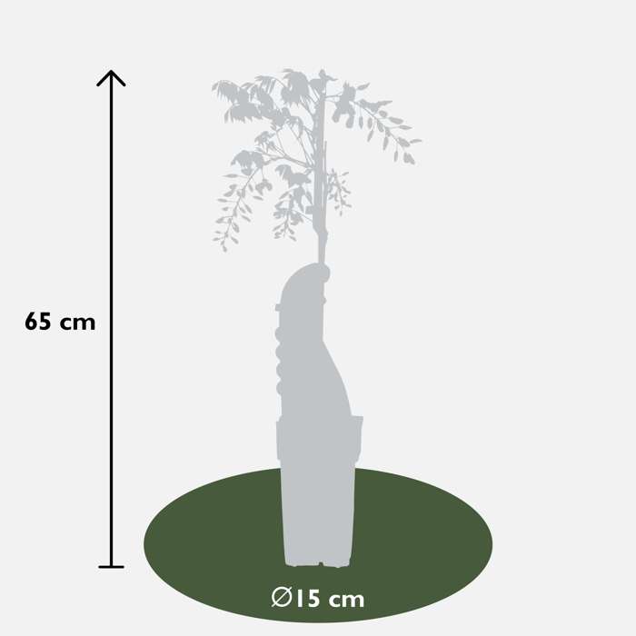 ‘Wisteria sinensis Caroline’ ook wel bekend als blauwe regen is een klimplant met mooie, zeer lange, donker blauw-paars kleurige bloemtrossen die massaal verschijnen in mei- juni. Er kan in september ook nog een nabloei plaatsvinden. Het is een snelgroeiende klimplant die een maximale hoogte van 10 meter kan bereiken. Om de wisteria het mooist in vorm te houden kun je hem het beste langs een pergola, schutting of rek leiden. Zorg daarbij voor stevige steun, waaraan de takken bevestigd worden en hij naar de zon kan klimmen. Daarnaast is het belangrijk de plant regelmatig terug te snoeien tijdens de groei of in het vroege voorjaar. Snoei liefst tweemaal per jaar. Knip in het vroege voorjaar, wanneer de plant zonder blad is, alle overbodige takken weg tot zo’n drie ogen. Uit de ogen op de zijtakken zullen later namelijk de bloemen verschijnen. In de zomer wanneer de plant volop aan het groeien is dan kun je het beste de lange uitlopers in de door jou gewenste richting leiden. Wanneer je deze niet nodig hebt kun je deze het beste verwijderen. Wanneer je de Wisteria compact houdt en een zonnige standplaats geeft zal deze nog rijkelijker bloeien met heerlijk geurende bloemtrossen in het voorjaar. Bij een goede verzorging kan de blauwe regen zelfs honderden jaren oud worden. Oudere stammen krijgen een decoratieve, gedraaide vorm. Heb wel even geduld met deze prachtige klimplant, het kan wel een paar jaar duren voordat de blauwe regen goed tot bloei komt.